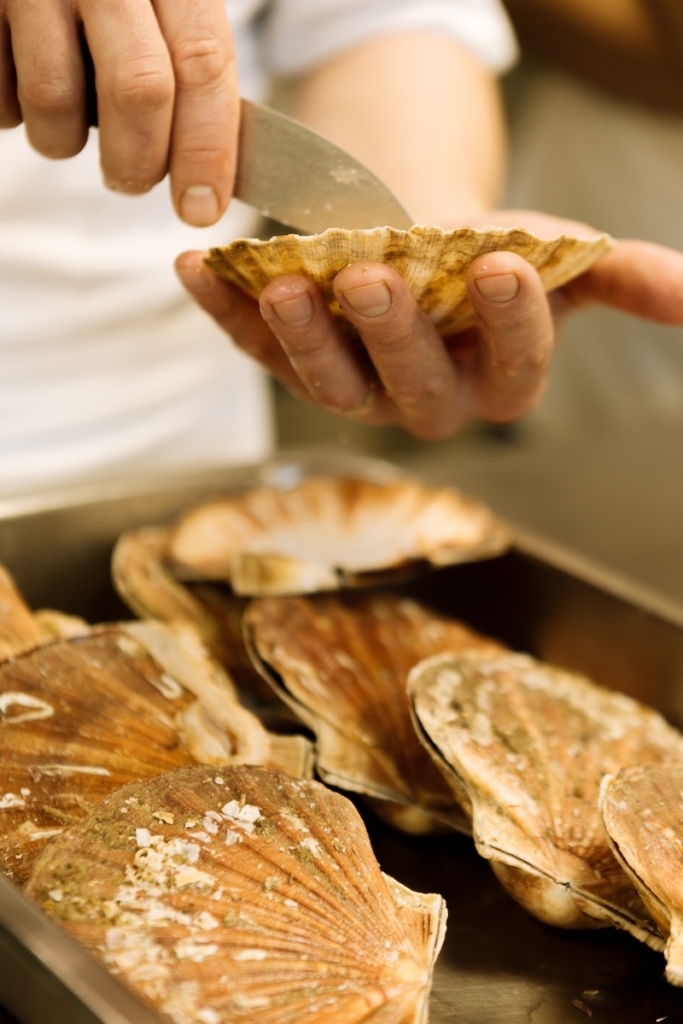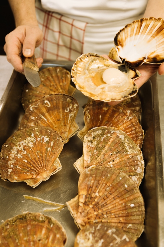 Au stand voisin, nous croisons le chef Didier Robin, du restaurant gastronomique Le Botanique au Château La Chenevière, qui vient refaire son stock de coquilles. Avec son bras droit, Hugo Genty, ils vont nous montrer combien la coquille peut se cuisiner de mille façons.