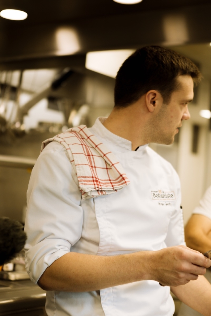À ses côtés, Hugo Genty, le bras droit, le complice. Hugo, c’est l’élan, la précision, l’œil toujours vif : « Avec Didier, on partage la même approche : le produit d’abord, toujours. Ici, rien ne sert d’en faire trop : la nature est suffisamment généreuse », glisse-t-il en ajustant une sauce, l’air de rien. Ensemble, ils forment un duo complémentaire : l’un lance une idée, l’autre affine, parfois c’est l’inverse. Dans leur cuisine, tout part du potager en permaculture que cultive Pierre Vandaële, deux hectares d’inspiration pure où poussent poireaux, capucines, courges, haricots Teggia, artichauts, fines herbes, fleurs comestibles… « Quand Pierre arrive avec une variété que l’on ne connaît pas, on réfléchit ensemble, on goûte, on imagine », raconte Hugo. Ici, ce sont les légumes qui donnent le tempo.