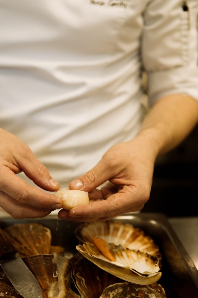 Pour notre reportage, c’est Hugo qui se charge des démonstrations en cuisine. On le voit attraper une coquille, la sentir, l’examiner, puis imaginer l’accord qui fera ressortir toute la finesse de sa chair nacrée. On note, par exemple, le travail des bardes, préparées un peu à la manière des tripes à la mode de Caen : « Elles sont confites dans du cidre toute la nuit, avec des épices, de la carotte et du céleri. On appelle ça des tripous », détaille Hugo. Quelques minutes plus tard, il dispose des rondelles finement découpées de noix de Saint-Jacques pour un carpaccio : « Le plus important, c’est de rester juste, simple en apparence. Une Saint-Jacques bien préparée n’a presque besoin de rien », explique-t-il. On sent que le duo prend un vrai plaisir à imaginer ces recettes, à les partager, à les faire vivre. Et on se sent privilégié d’assister à ce spectacle.