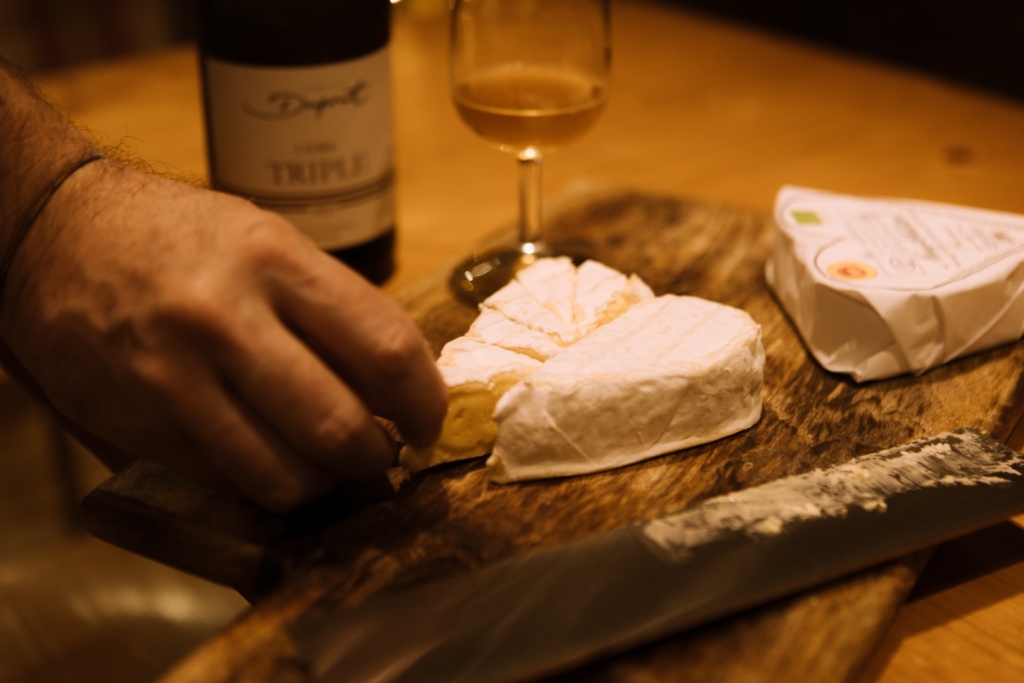 Sur la planche que David nous prépare, le Neufchâtel est associé avec un Cidre du Pays d’Auge. L’accord est limpide : la bulle fine et la fraîcheur fruitée étirent la pâte, réveillent le sel, prolongent la note lactée : « Il n’y a rien de mieux que deux produits du même terroir associés ensemble. Ils vont se parler amoureusement. », insiste-t-il.