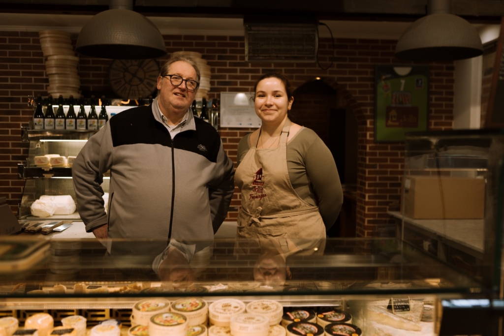 Avant de retrouver David, nous passons par Rouen et foulons les pavés des Halles du Vieux-Marché. Capitale gourmande de la Seine-Maritime, les fromages normands trouvent une place de choix au milieu des étals animés. Derrière le comptoir de la Maison Jollit, Daniel Bourgeois nous salue avec un large sourire. Il porte en lui un amour évident pour ces produits.