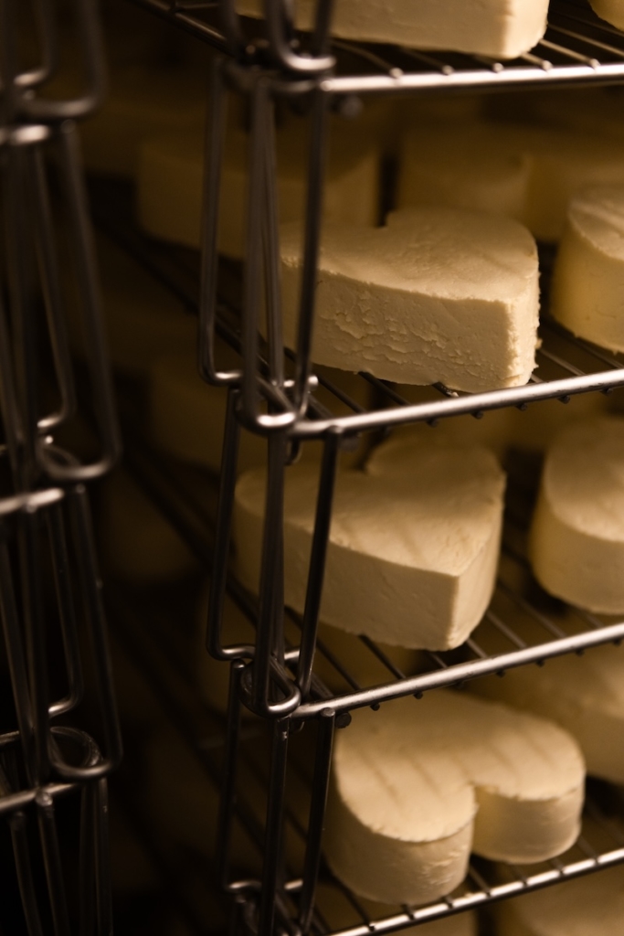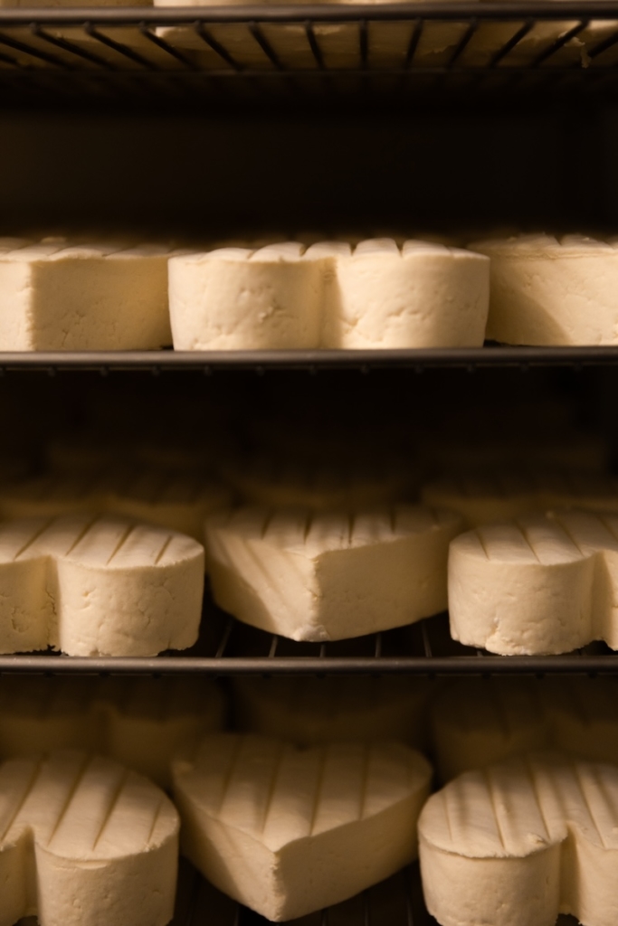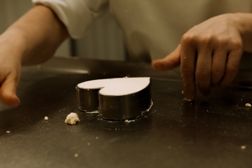 Vient ensuite l’égouttage, étape emblématique du Neufchâtel. Le caillé est versé dans de grands sacs de toile, suspendus, puis superposés sur des tables. Par gravité, le petit-lait s’écoule lentement. Après quarante-huit heures, la pâte est pétrie, salée, puis moulée à la main. Les moules en forme de cœur donnent au fromage son identité. Un geste répété des centaines de fois par jour : on prend la pâte, on la roule dans la paume, on la tasse délicatement. Pour un cœur de 200 g, il faut près d’un litre et demi de lait. Un ratio qui dit l’exigence du produit.